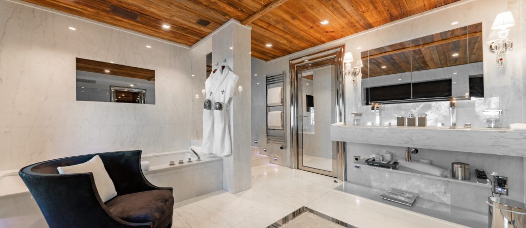 Every suite is composed of its own bedroom with connected dressing room and bathroom. With its wine cellar, cinema, night club, spa with hammam, fitness, hairdresser space and massage rooms, Mont Blanc View offers all services and equipment necessary to enjoy a beyond-the-normal experience.