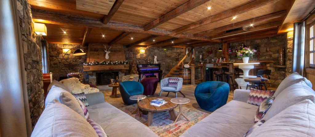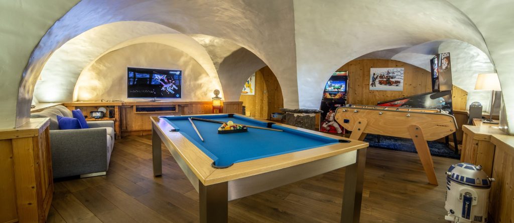 Upon arrival, guests are welcomed on the ground floor with the convenience of private parking and a spacious garage. Inside, a dedicated ski room awaits, fully equipped with boot warmers, glove dryers, ski racks, and seating. A wine cellar, professional kitchen and elegant dining room set the stage for gourmet experiences, while the lounge bar with piano, large living room with fireplace and outdoor winter lounge offer inviting spaces for gathering. The chalet also has a private cinema room with projector and large screen, as well as a dedicated playroom for children.